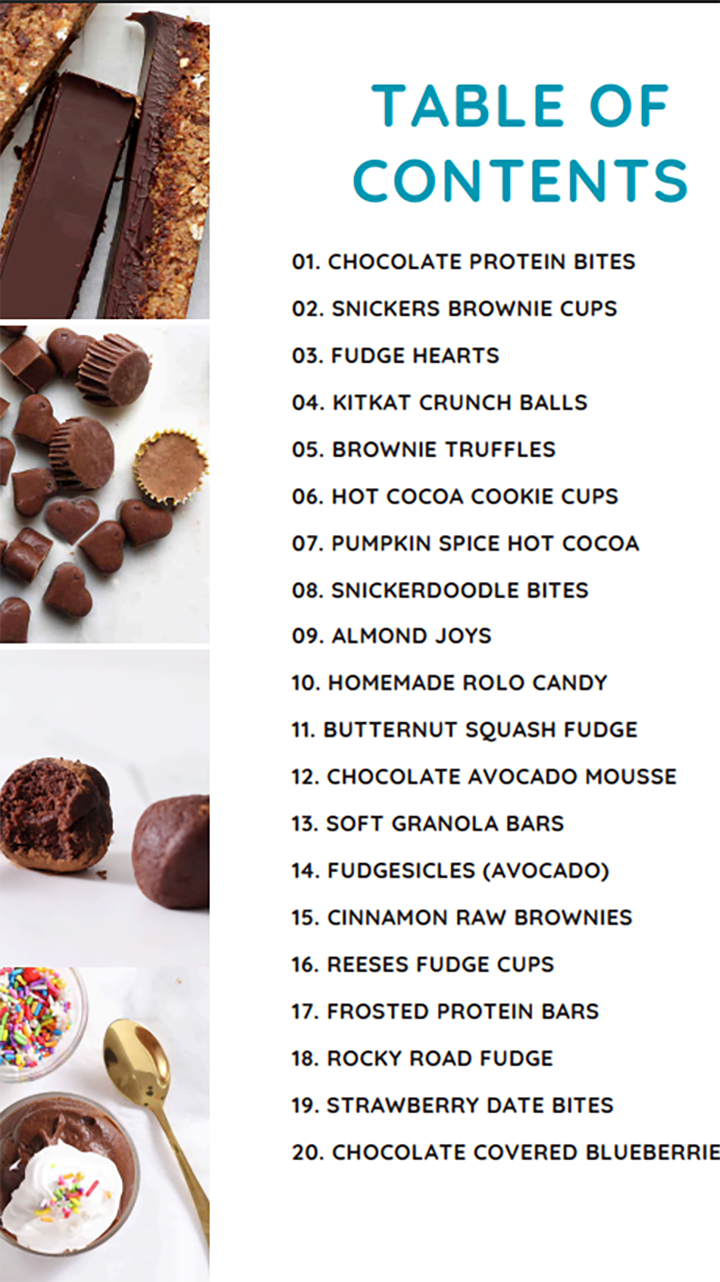 High Protein Reese's Cups, Butternut Squash Fudge, Chocolate Avocado Mousse, Fudgesicles, Fudgy Cinnamon Brownies, Soft Chocolate Granola Bars & more...